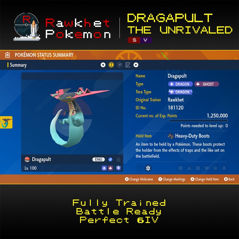 Dragapult the Unrivaled comes with its Mightiest Mark, has a battle ready moveset, and is fully EV trained.