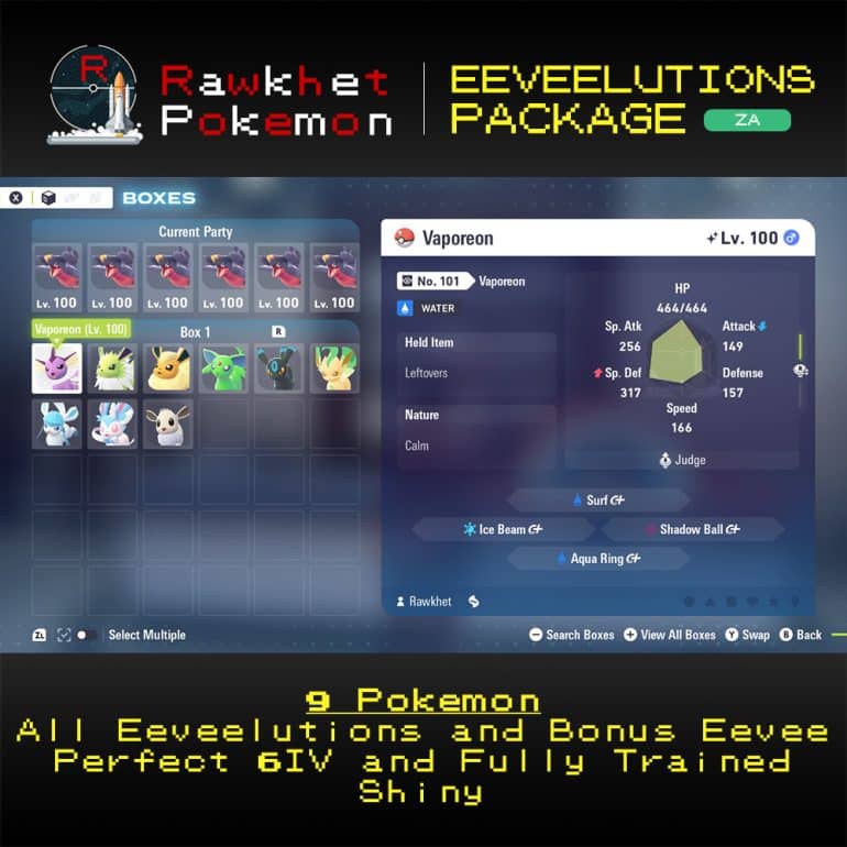 Get every Eeveelution in your Pokemon Legends: Z-A game! Each of them has been fully trained with recommended sets. Comes with a bonus Eevee. Shiny options available!
