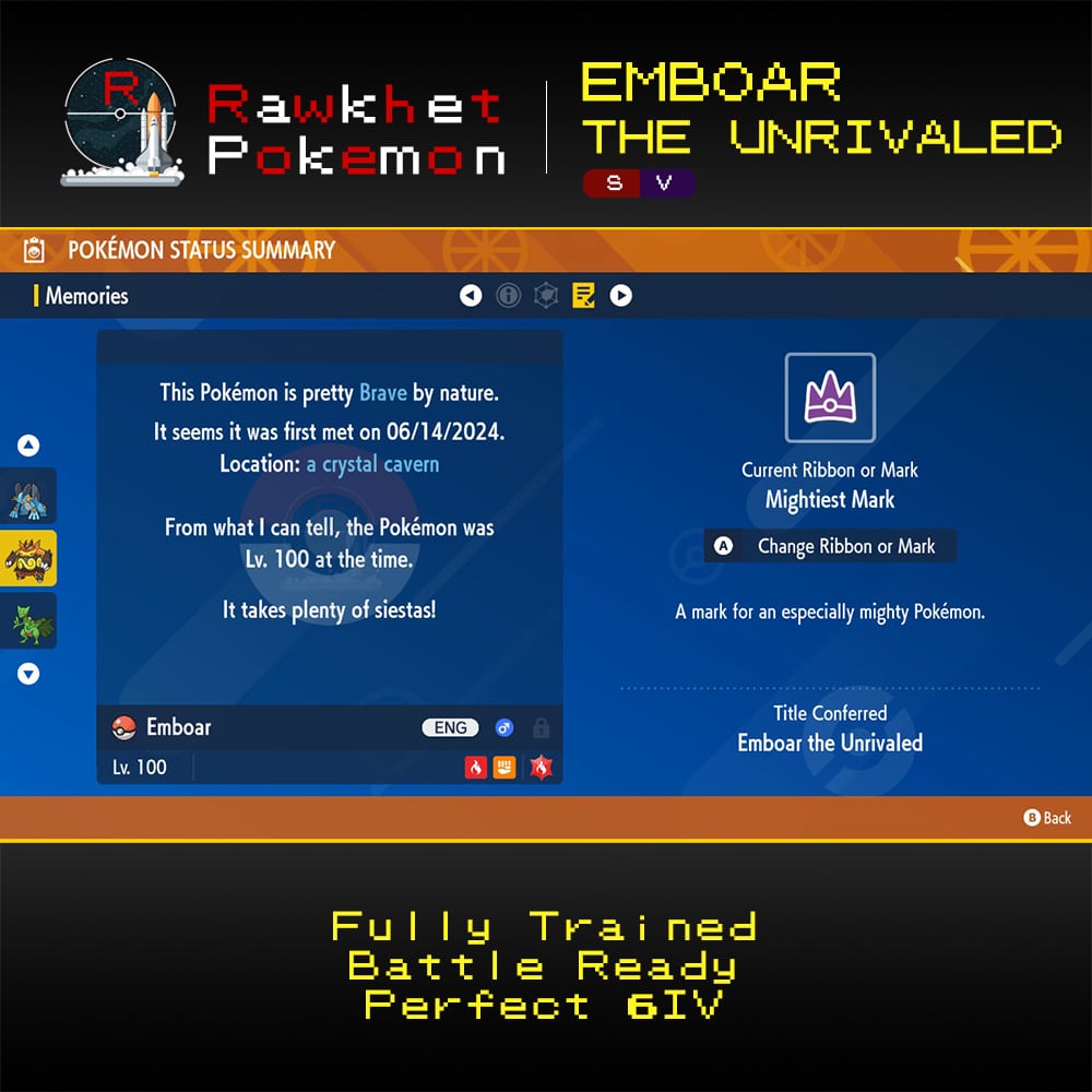 Emboar the Unrivaled comes with its Mightiest Mark, has a battle ready moveset, and is fully EV trained.