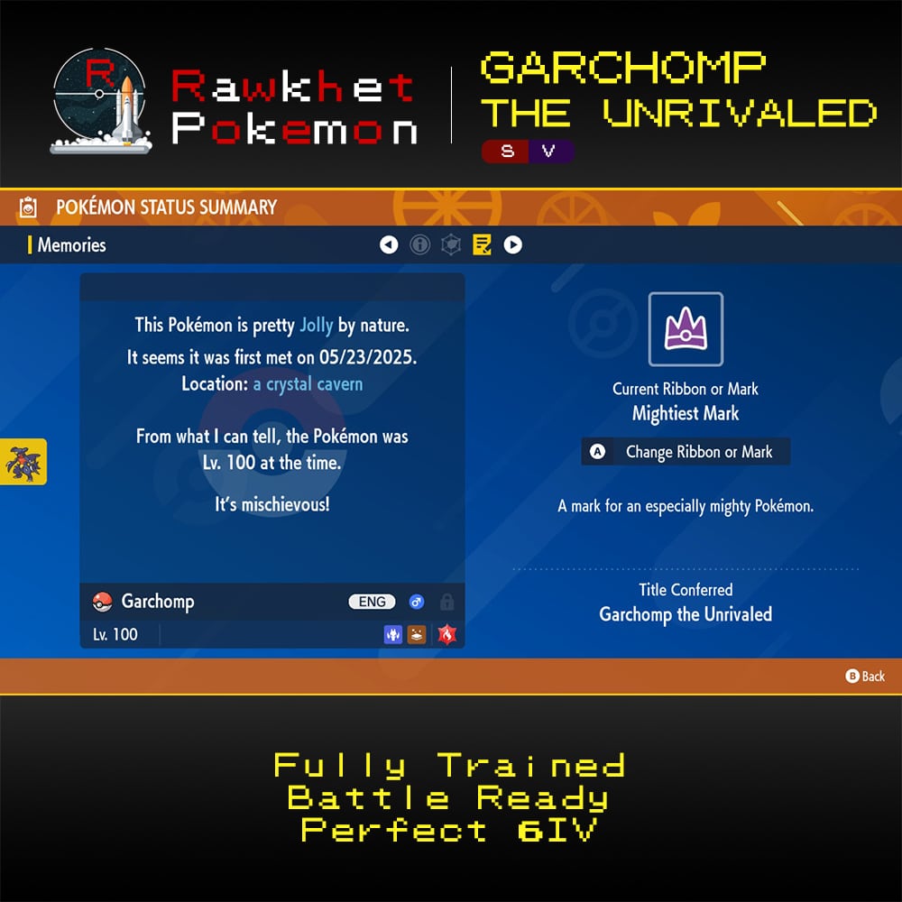 Garchomp the Unrivaled comes with its Mightiest Mark, has a battle ready moveset, and is fully EV trained.