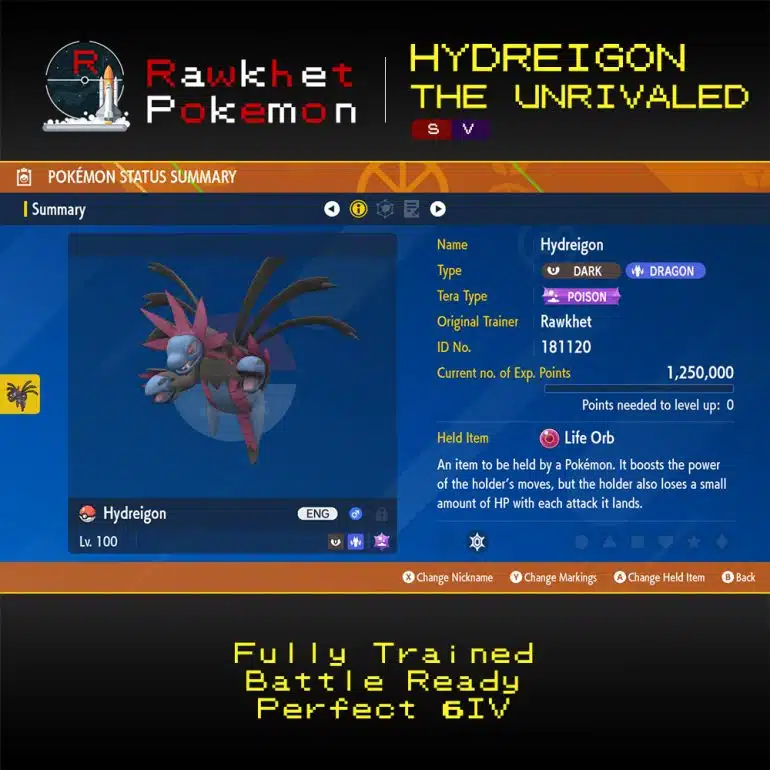 Hydreigon the Unrivaled comes with its Mightiest Mark, has a battle ready moveset, and is fully EV trained.