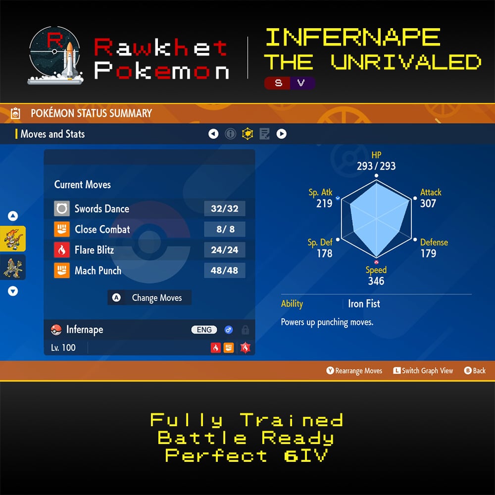Infernape the Unrivaled comes with its Mightiest Mark, has a battle ready moveset, and is fully EV trained.