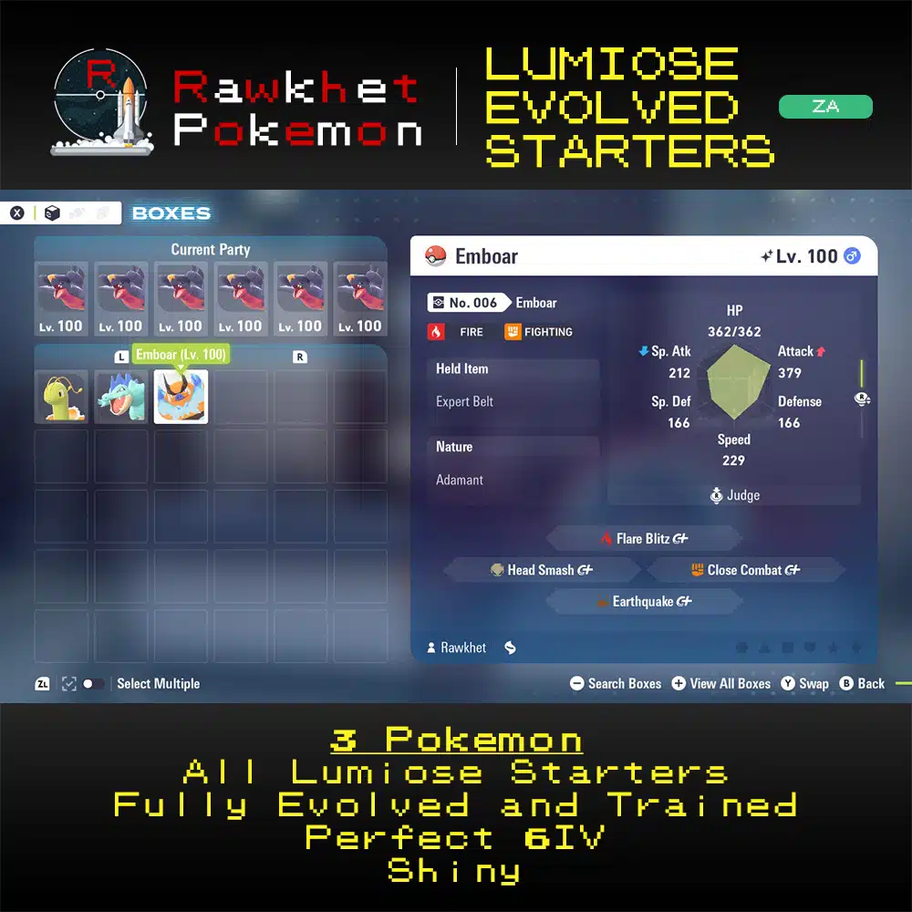 Welcome to Lumiose! Get all 3 starters for Legends Z-A, fully evolved and trained up for immediate use in the Z-A Royale and beyond. Shiny options available!