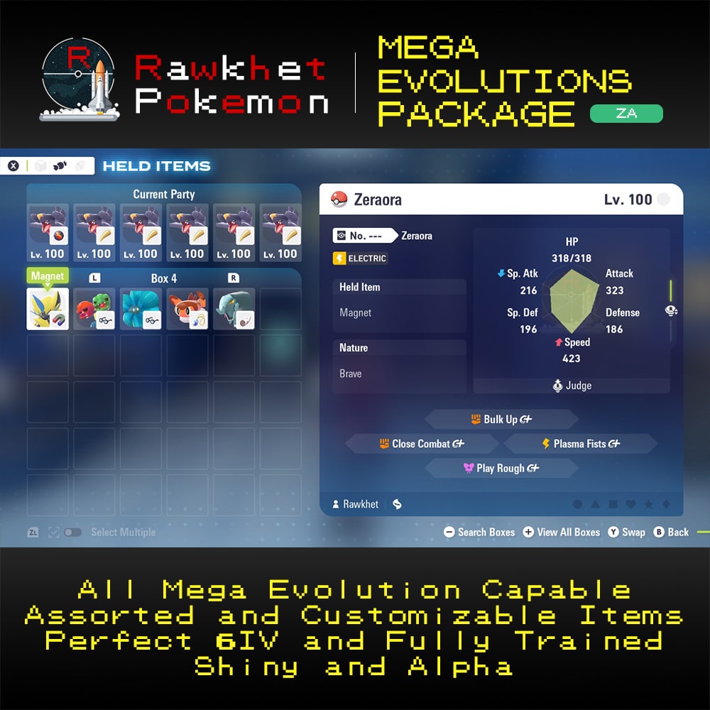 Get every Pokemon capable of Mega Evolution in this one mega package for Pokemon Legends: Z-A. Each of them has been fully trained with recommended sets to destroy anything in their way. Shiny options available!
