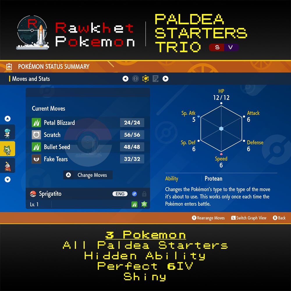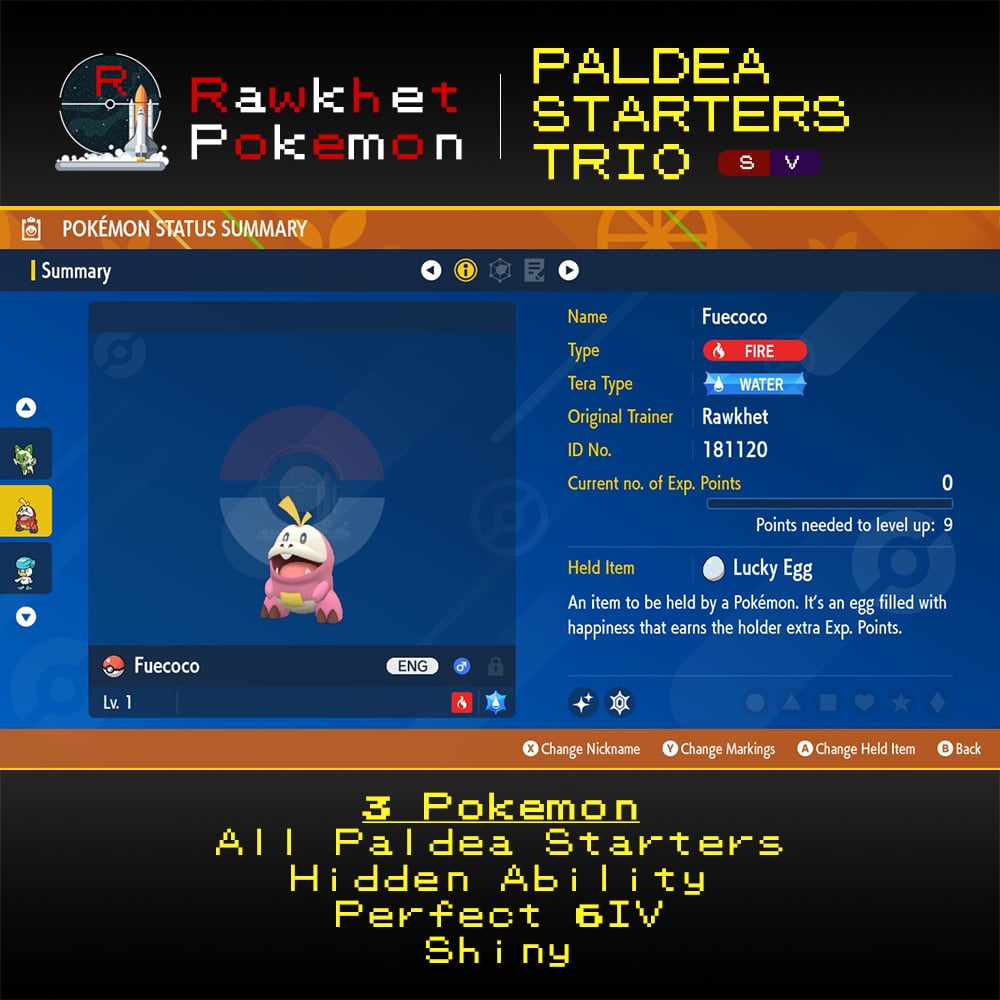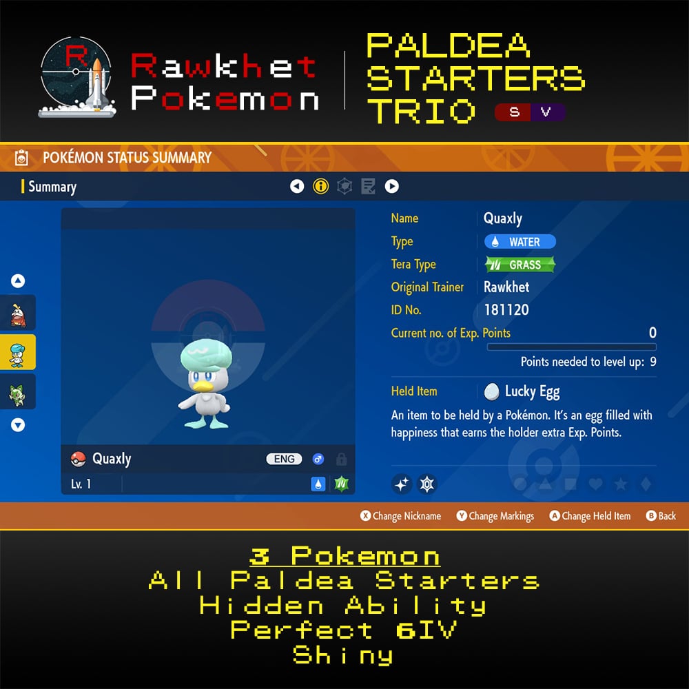 Get the full set of Paldean Starters here! Why settle for one when you can get Sprigatito, Fuecoco, and Quaxly to join you on your journey. The Paldea Starters Trio come Shiny, with Perfect 6IV, holding a Lucky Egg, and have their Hidden Abilities.