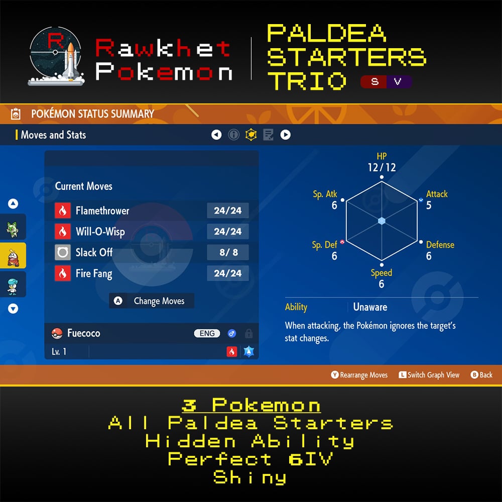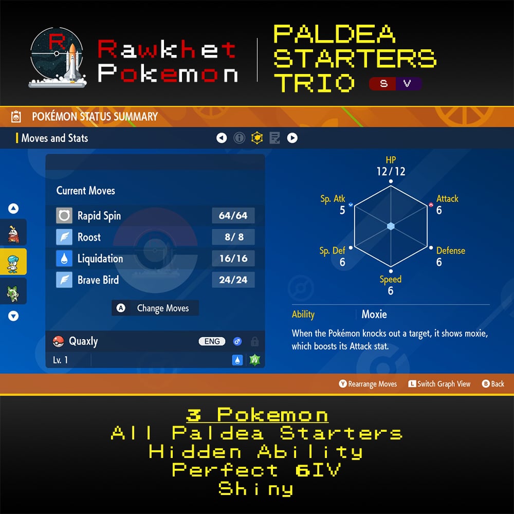 Paldea Starters Trio (3x, 6IV, Shiny, Hidden Abilities) – Pokemon Scarlet and Violet