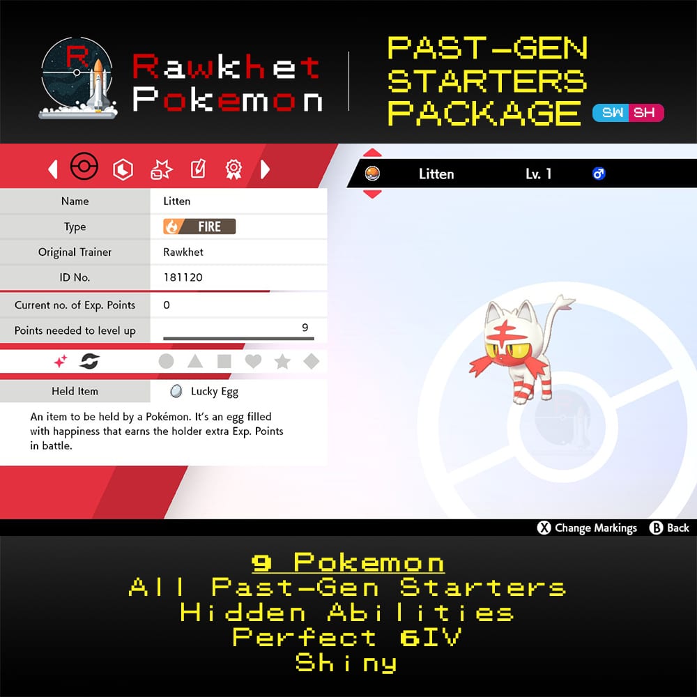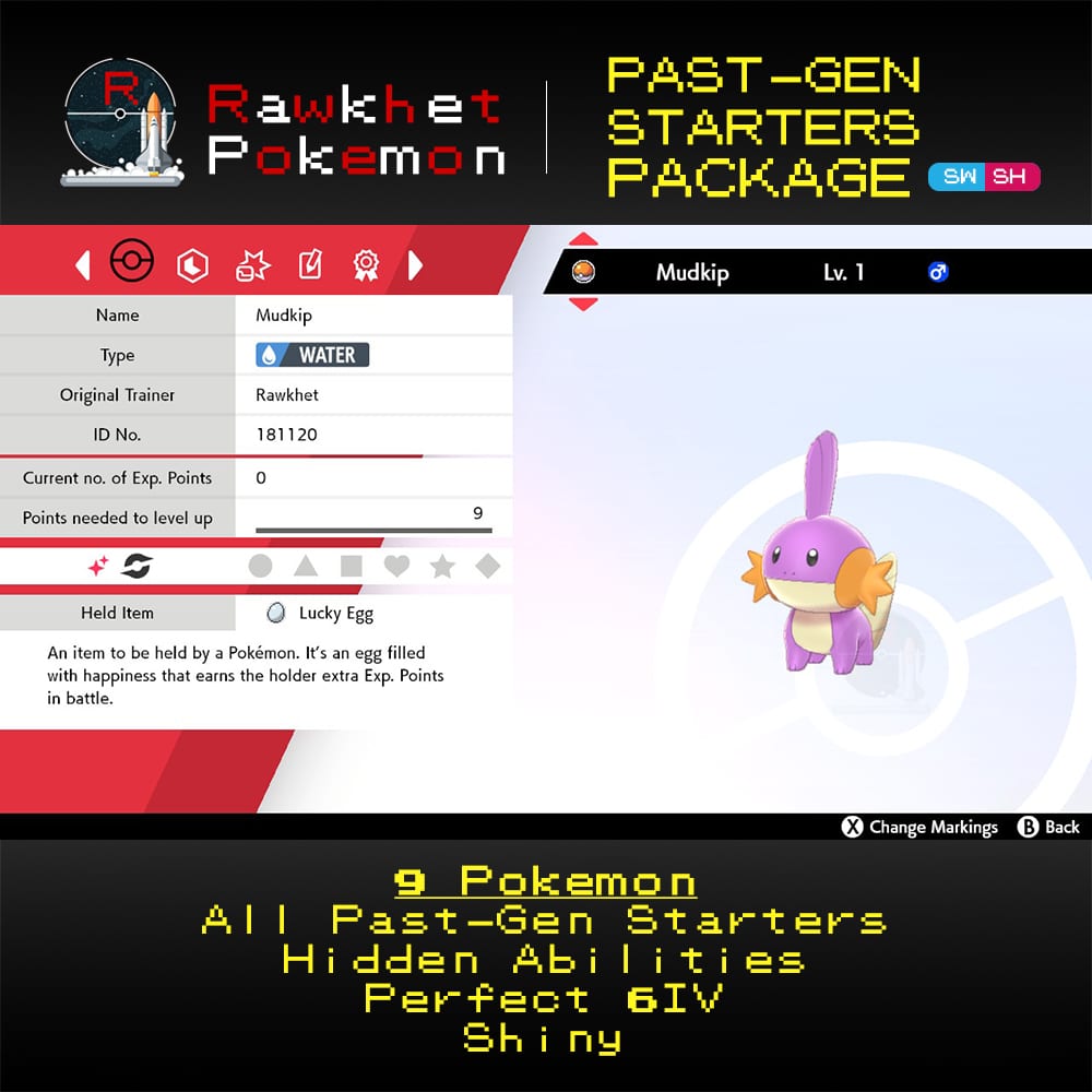 Get all 9 past-gen starter Pokemon! The starters will all be Level 1 with Perfect 6IVs. They will also have a recommended competitive nature.