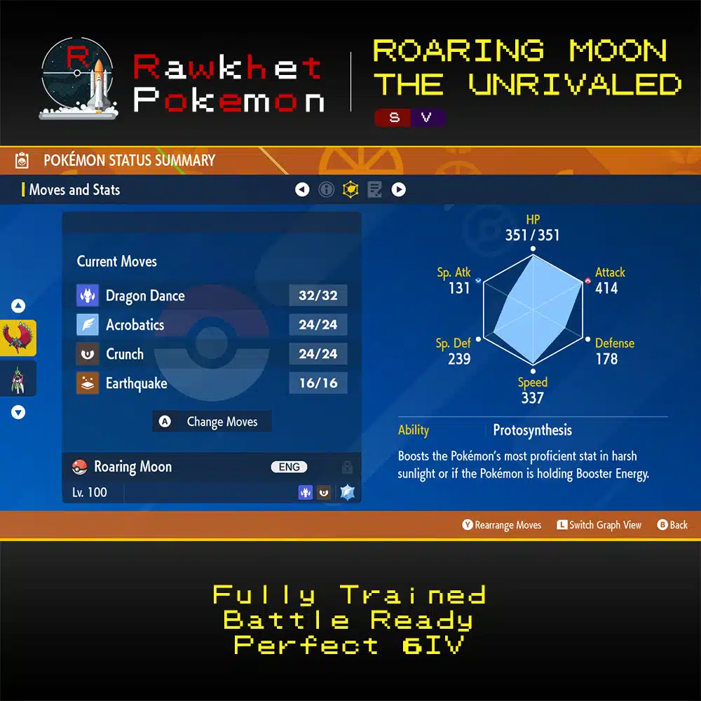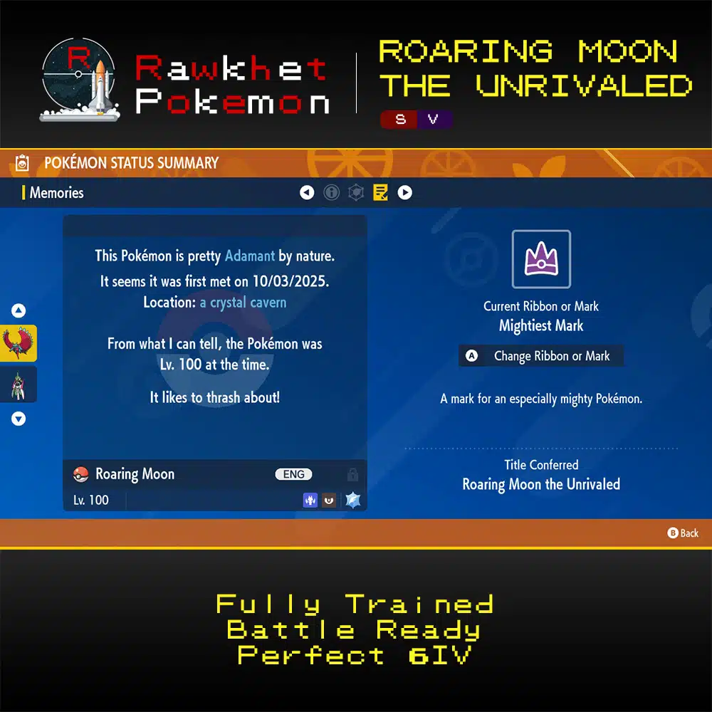 Roaring Moon the Unrivaled comes with its Mightiest Mark, has a battle ready moveset, and is fully EV trained.