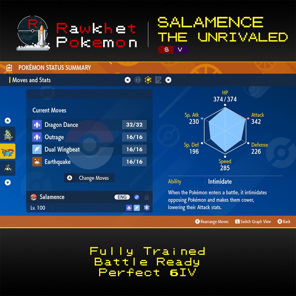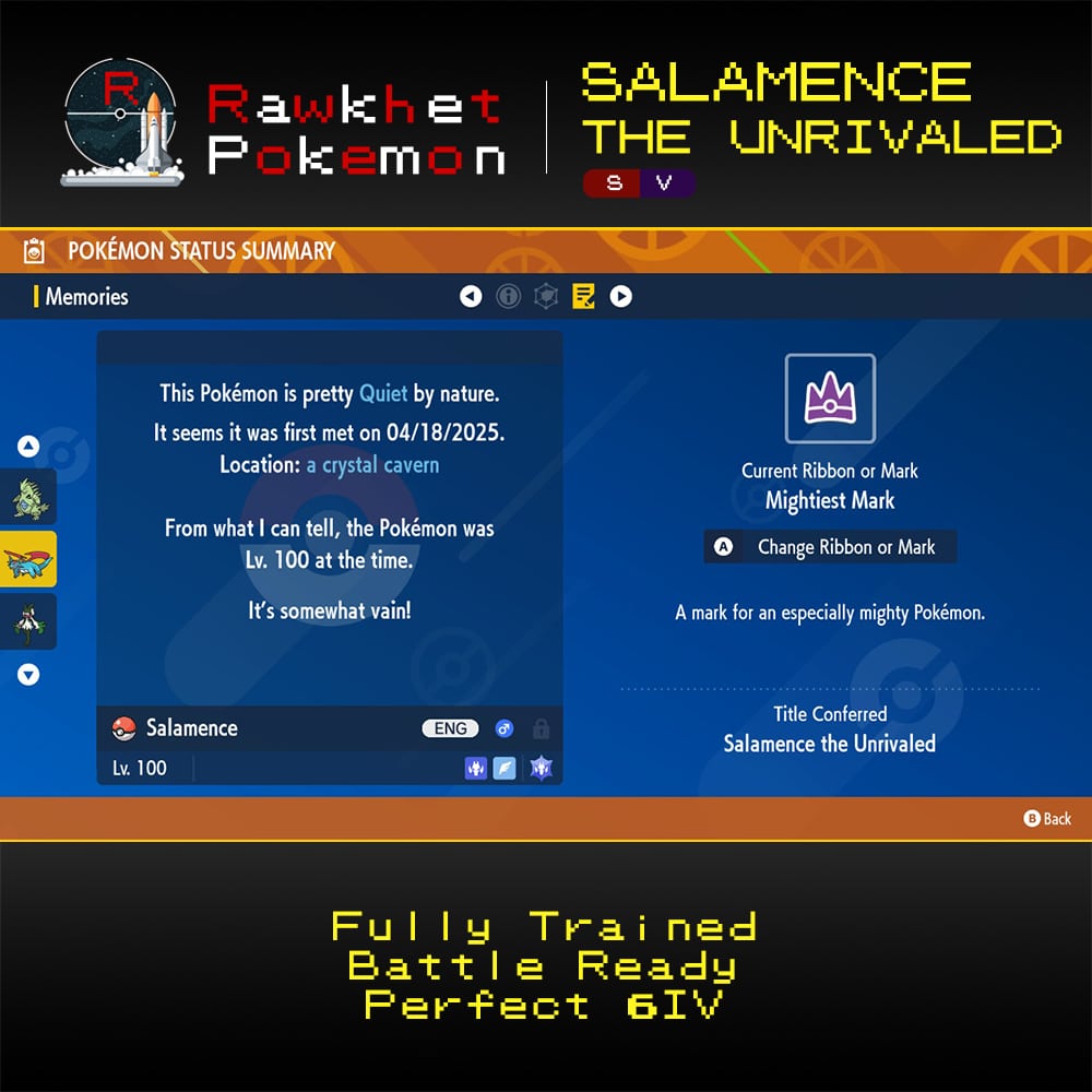 Salamence the Unrivaled comes with its Mightiest Mark, has a battle ready moveset, and is fully EV trained.
