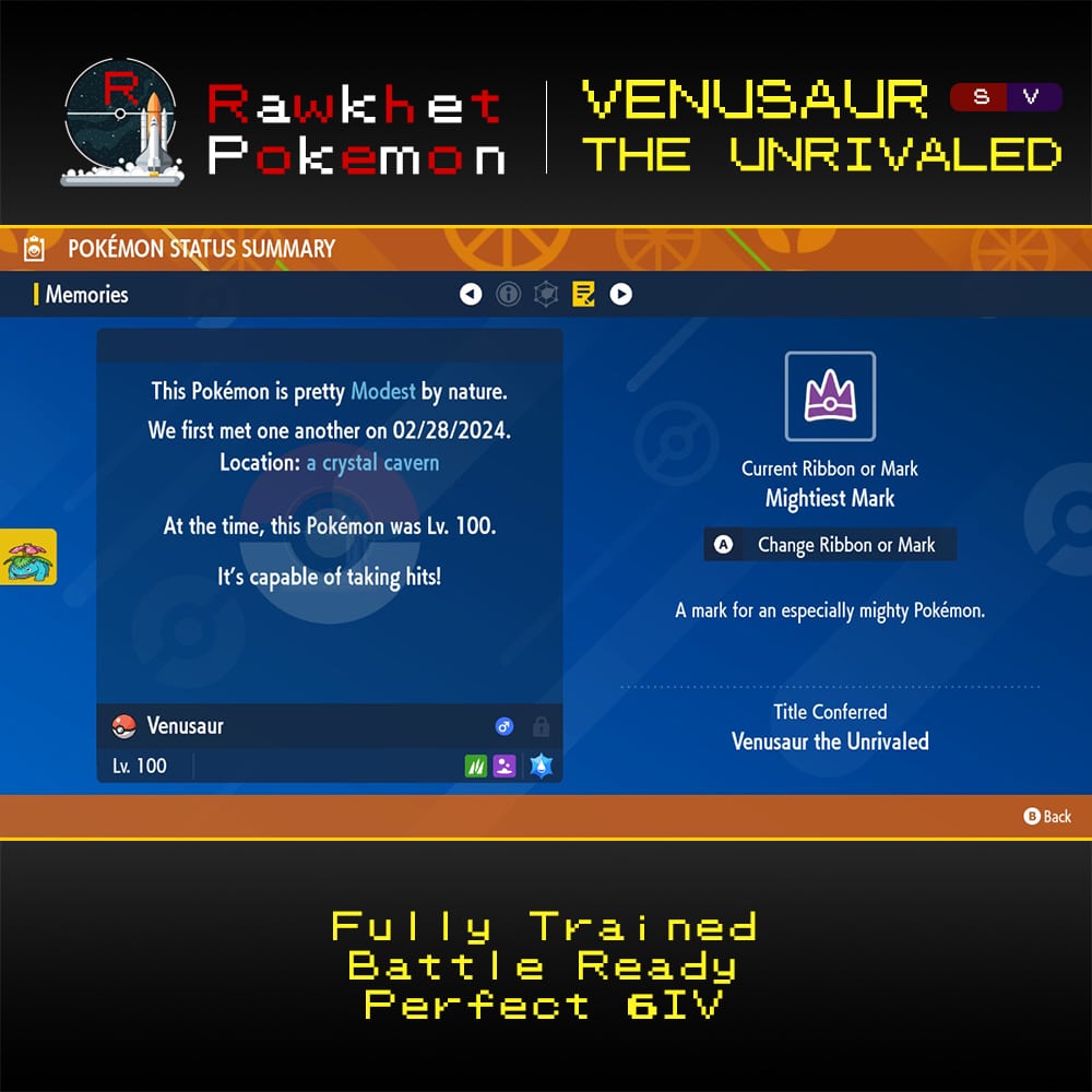 Coming full circle, we’re back in Generation 1 with Venusaur the Unrivaled, sporting its Mightiest Mark! Released just after Pokemon Day, get one with a battle ready moveset, fully EV trained, and ready to spring into battle.