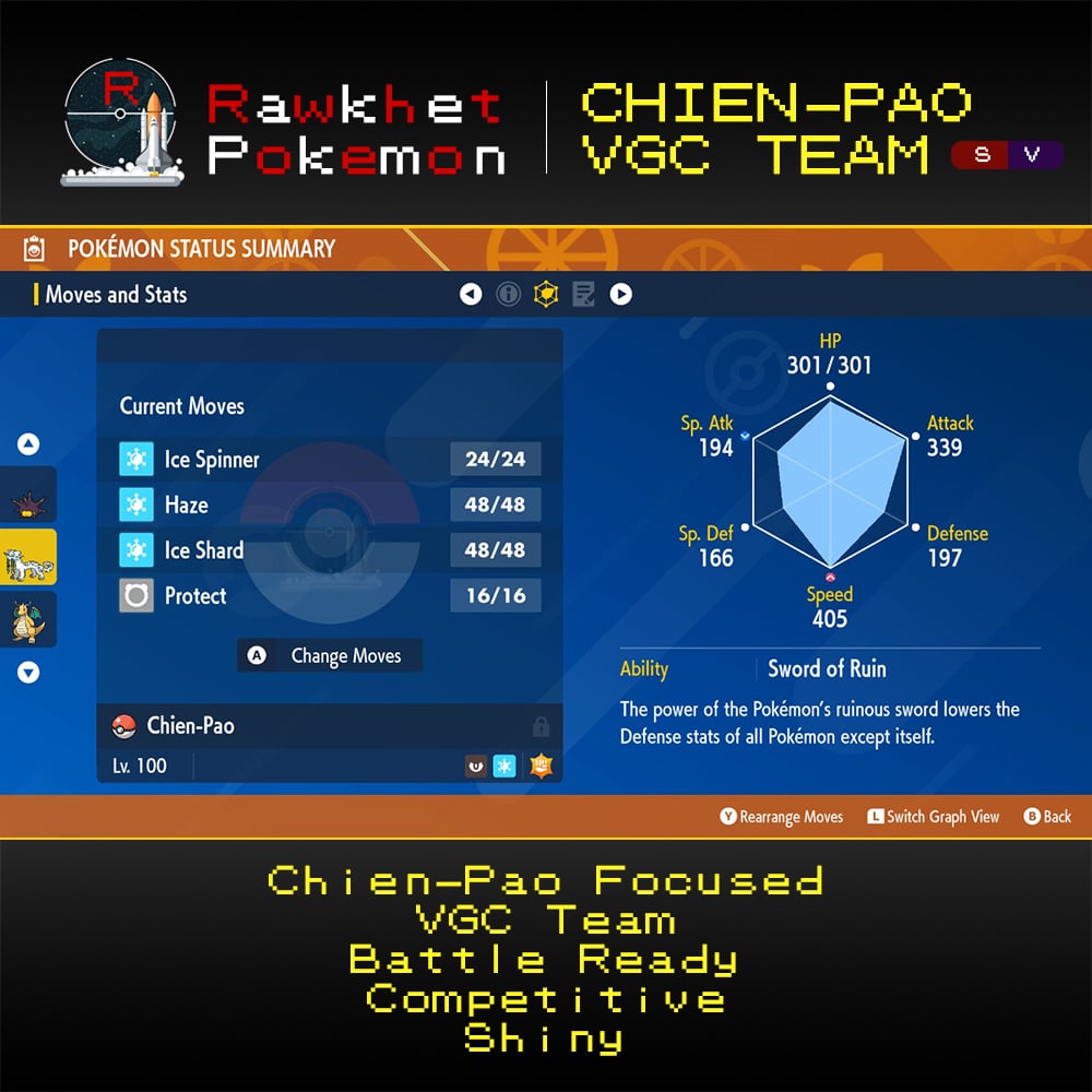 The Chien-Pao centered VGC team has a strong focus on speed control and offensive pressure. Overall, this team aims to control the tempo of the battle and capitalize on its offensive threats.