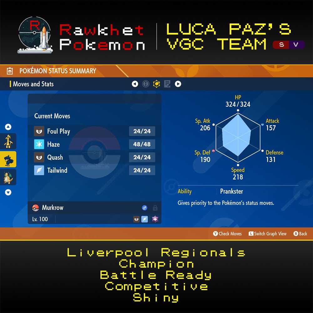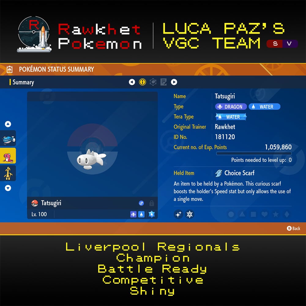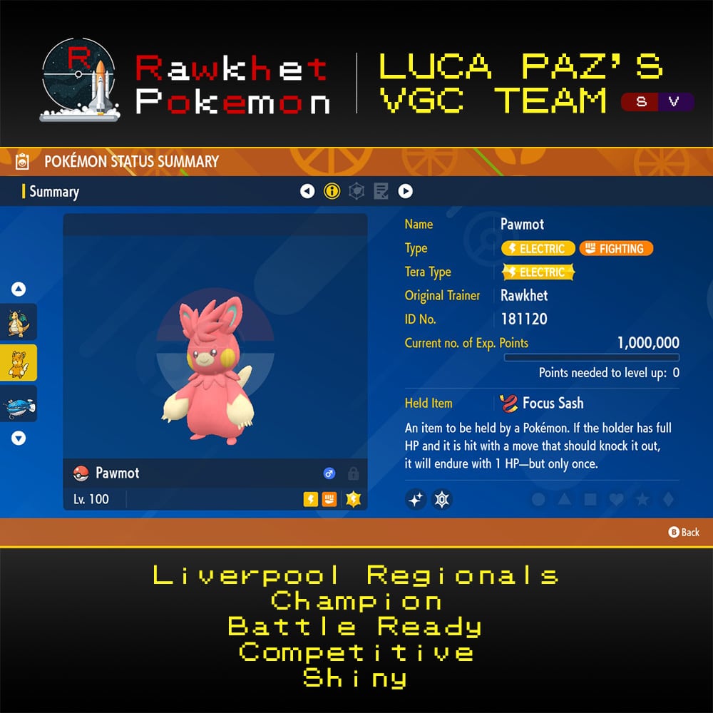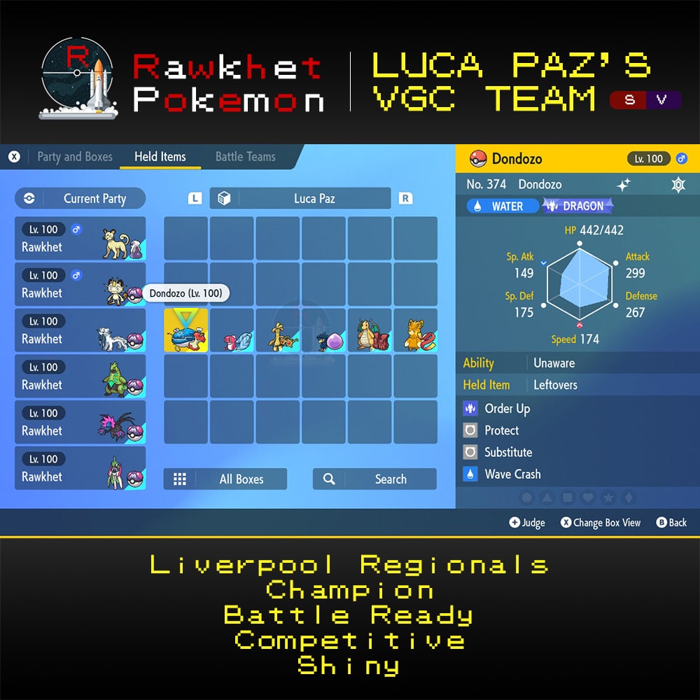 Looking to dominate your competition like Luca Paz, the champion of Liverpool Regionals? Look no further than our preset VGC team inspired by their winning strategy! This team is fully trained and battle ready for your next tournament. Don’t settle for mediocrity, get the same team used by a champion and rise to the top!
